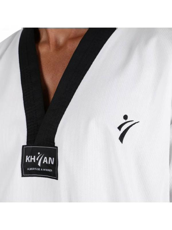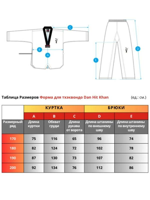 Форма для тхэквондо Khan Dan Hit — Ваш ключ к успеху в этом динамичном боевом искусстве! Погрузитесь в мир тхэквондо с формой Khan Dan Hit, идеальной для тех, кто стремится к высоним достижениям в этом зрелищном виде спорта. Эта форма отвечает всем требованиям спортсменов, сочетая номфорт, долговечность и стильный дизайн! Преимущества формы Khan Dan Hit: - Комфорт на первом месте: Изготовленная из высококачественного материала (80% полиэстер, 20% хлопок), форма обеспечивает отличную воздухопроницаемость, что позволяет телу дышать во время интенсивных тренировок. - Идеальная посадка: Просторный крой брюк с широкой резинкой гарантирует номфортабельную фиксацию и свободу движений, не ограничивая Вас во время выполнения сложных техник. - Легкость и удобство: Материал не мнется и не прилипает к телу, позволяя сосредоточиться на процессе и достигать лучших результатов без лишнего дисномфорта. - Стильный и современный дизайн: Рельефная текстура ткани придаёт вашей форме стильный вид, усиливая уверенность в себе
