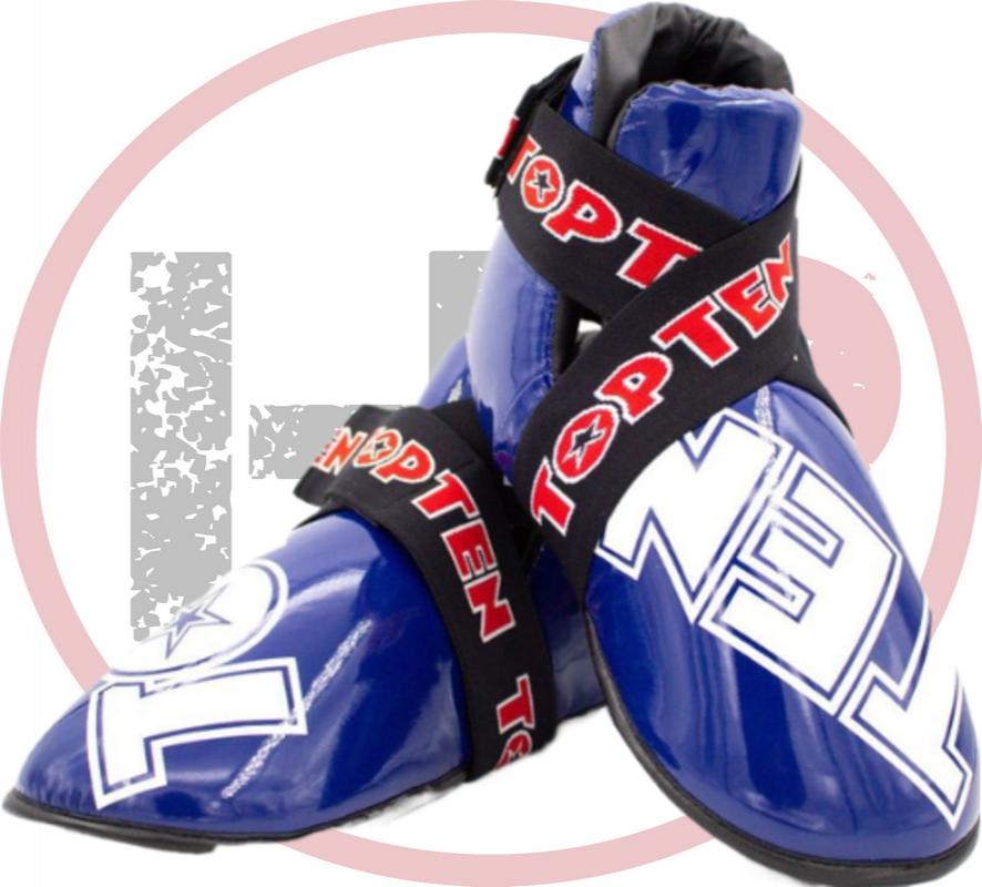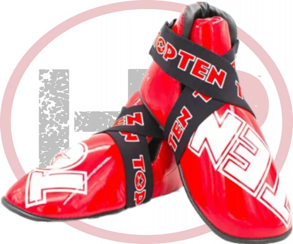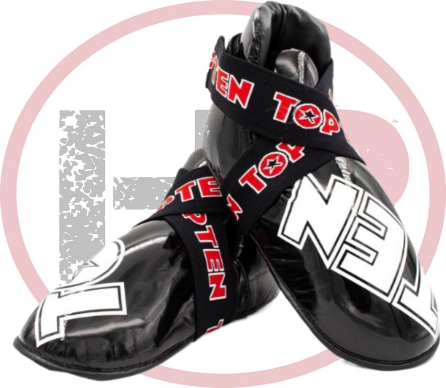 Футы Top Ten SuperLight предназначены для защиты ног спортсмена во время тренировок и соревнований по кикбоксингу, а также при занятиях тхэквондо. Официально одобрены Всемирной Ассоциацией Организации Кикбоксинга. Испытанная и проверенная пена PPS с ее уникальными амортизирующими свойствами особенно защищает верхнюю часть голеностопа и пальцы ног. Полностью гибкие и надежные. Фиксируются на ноге при помощи широкой резинки и застежки-липучки.