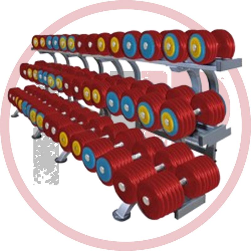 Набор неразборных обрезиненных гантелей на трёхрядном стеллаже длиной 310 см. Гантели составлены из обрезиненных дисков Антат, ручки вращающиеся хромированные. Надежное крепление дисков на грифах обеспечивает полную безопасность и комфорт тренировок.