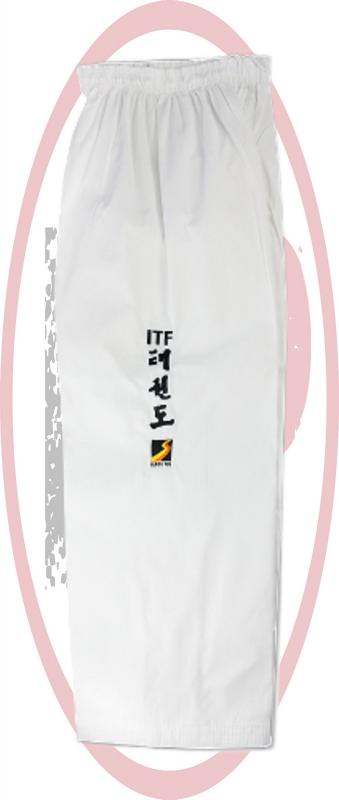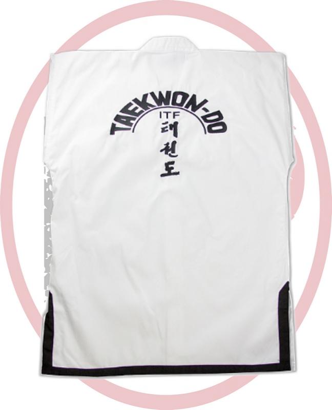 Изготовлен добок для тхэквондо ITF из смешанной ткани, поликоттон, плотностью 200 г/м². Униформа из такой ткани легко стирается и гладится, дает меньшую усадку после стирки, лучше держит форму и имеет более аккуратный "белый" вид. "Black Belt" — униформа "черных поясов", от 1 дана до 4-го. Куртка на липучке (лента Велькро), с черной окантовкой по низу. Все изображения и надписи нанесены вышивкой, что обеспечивает хороший внешний вид и долговечность. Просторные длинные брюки на поясе удерживаются широкой резинкой и вставным шнуром. Особенность составных брюк заключена в специальной вставке, шириной несколько сантиметров, которая начинается в паху и идет до самого низа штанины, замещая внутренний шов.