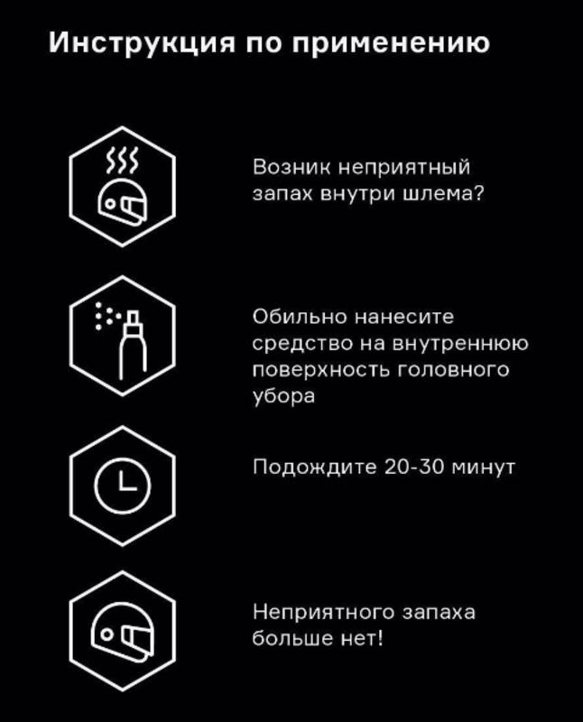 Новый нейтрализатор запаха на молекулярном уровне Helmetex Pro - не имеет аналогов в Мире. Эффективно решает проблему неприятных запахов спортивных и мотоциклетных шлемов, касок, шапок, фуражек, бейсболок и других головных уборов. Удаляет неприятный запах, воздействуя непосредственно на молекулы, являющиеся его источником. Обладает антибактериальным и дезинфицирующим действием. Средство от запаха подходит для обработки любых видов поверхностей: текстиль, поролон, натуральная и искусственная кожа, замша, пластик и т.д.