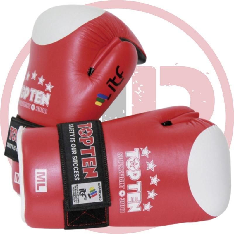Перчатки с открытой ладонью TOP TEN "NEW ITF SUPERFIGHT 3000" предназначены для тренировок и выступлений на соревнованиях даже международного класса по тхэквондо. Сертифицированы ITF! Манжета на «липучке».