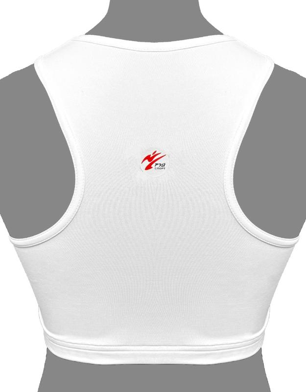 Защита на грудь женская Щ56Э служит для защиты грудных желез во время поединков по различным видам единоборств. Защита груди выполнена в виде майки-топа, который надевается через голову. Нагрудник имеет два раздельных защитных вкладыша, для удобства ухода за изделием вкладыши легко извлекаются из своих карманов. Область солнечного сплетения открыта. Конструкция нагрудника обеспечивает надежную защиту от неакцентированных ударов и не стесняет движения. Материал топа - эластичный трикотаж Материал защитных вкладышей - вспененный полимер EVA